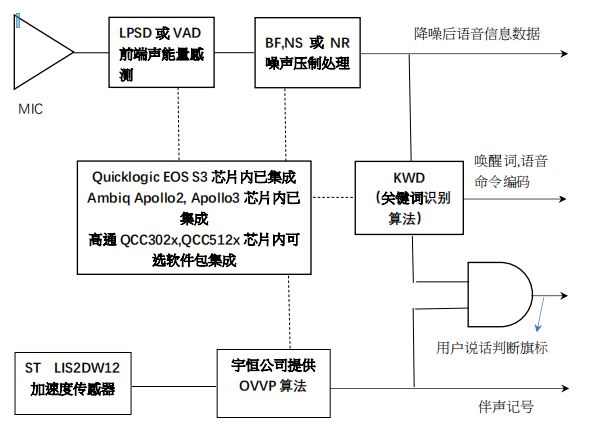 络达、瑞昱、恒玄等芯片产品建议搭配QuickLogic S3、Ambiq Apollo2、 Apollo3 或楼氏 IA-610、IA-611 智能麦克风芯片以达到在高算力低功耗要求下,满足本地唤醒词的功能。