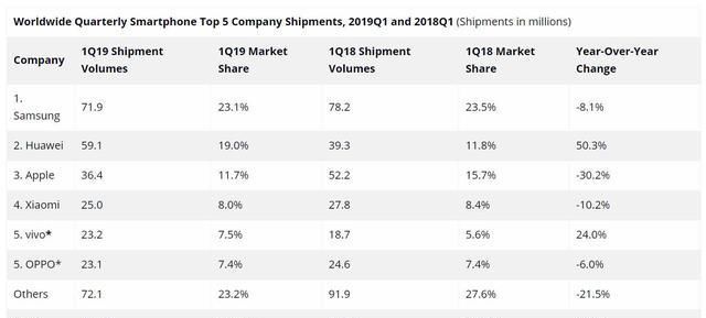 IDC最近发布的2019年第一季度全球智能手机市场的调研报告。数据显示,全球智能手机出货量为 3.108 亿台,同比下降 6.6%。其中排在全球出货量前六位的厂商也大部分处于同比下降的状态,Apple甚至下降超过了 30%。