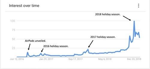 据Above Avalon报道,最近三年假日AirPods在谷歌上的峰值搜索兴趣,索引为100(代表最大搜索兴趣)。2016年的峰值为10,2017年为20,2018年为100,同比增长了500%,这样的增长速度实在令人吃惊。